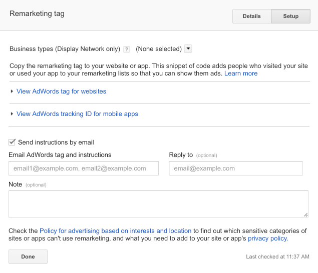 You can email this tag to your technical support team, if you do not feel comfortable installing it. Make sure this tag is installed on every web page on your site. Doing so will give you more freedom to run a variety of re-marketing campaigns to reach your ad group.