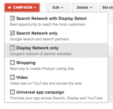 Once your re-marketing list has been created, it’s time to turn your attention to creating the re-marketing campaign in AdWords. To initiate the process, navigate to the ‘Campaigns’ tab of your AdWords account and click the ‘+Campaign’ button. Then select ‘Display Network only.’